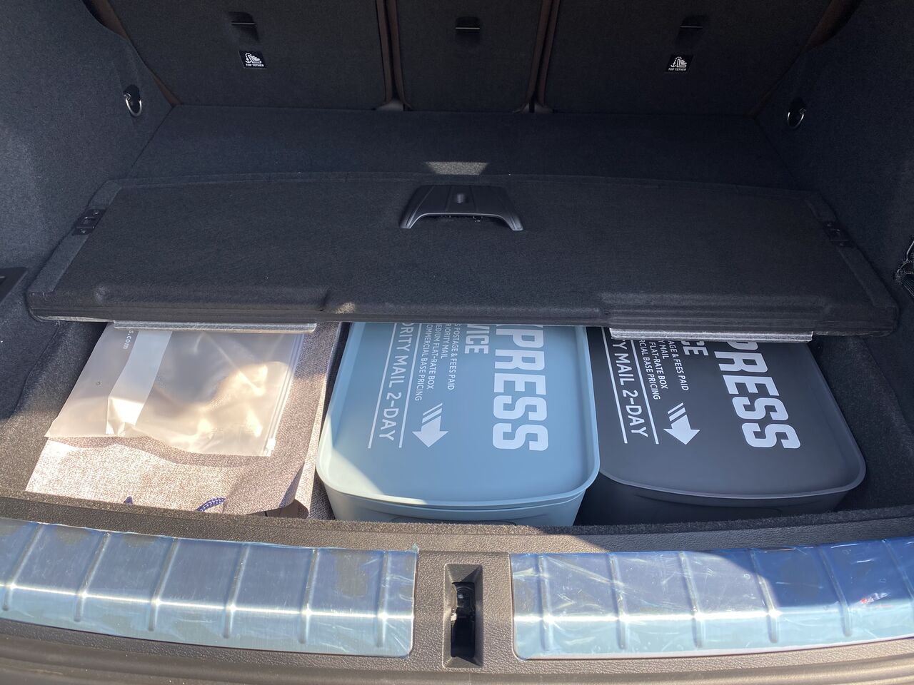 X1はトランクの床下収納があるので、薄手のボックスを用意して、サンシェードや保冷袋など、ちょっとしたグッズを入れています。ここにしまうと、トランクルームがまるまる空いた状態で使えるので、地味に便利。