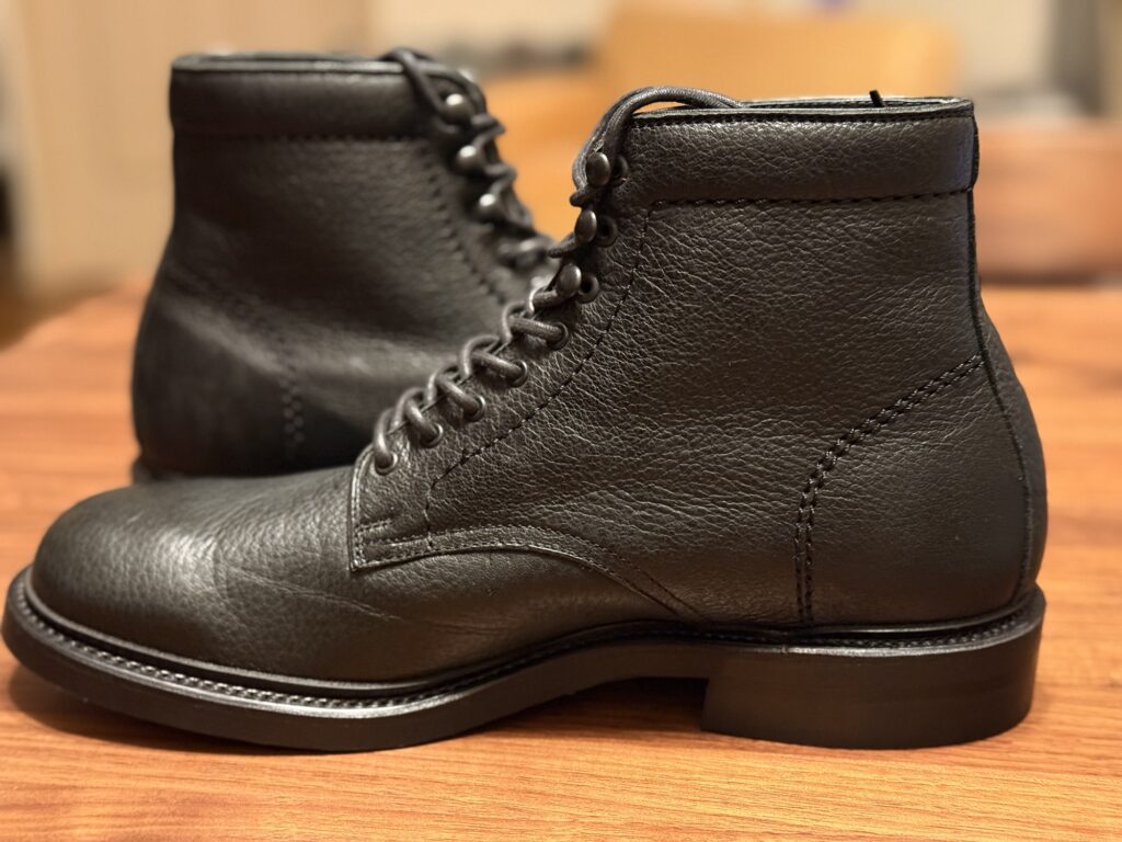 形はワークブーツみたいな感じの1枚革を使ったセミフォーマルブーツで、カジュアルなセットアップからジーンズまで、相性が良さそうな感じです。よくある8ホールブーツで、上段3つフックになってるのが、特徴。