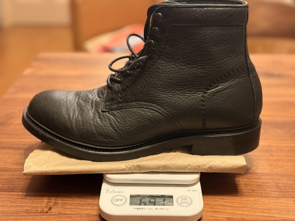691グラムと、履き心地の軽やかさに反して、レザーブーツとして標準的な重さです。(やや重めのレッドウィング アイリッシュセッターは、750g前後)