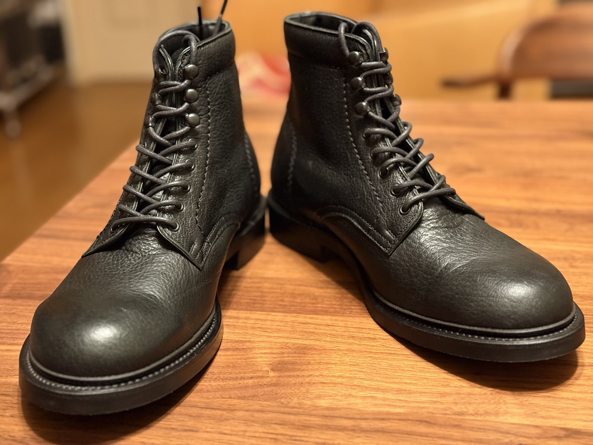 形はワークブーツみたいな感じの1枚革を使ったセミフォーマルブーツで、カジュアルなセットアップからジーンズまで、相性が良さそうな感じです。よくある8ホールブーツで、上段3つフックになってるのが、特徴。