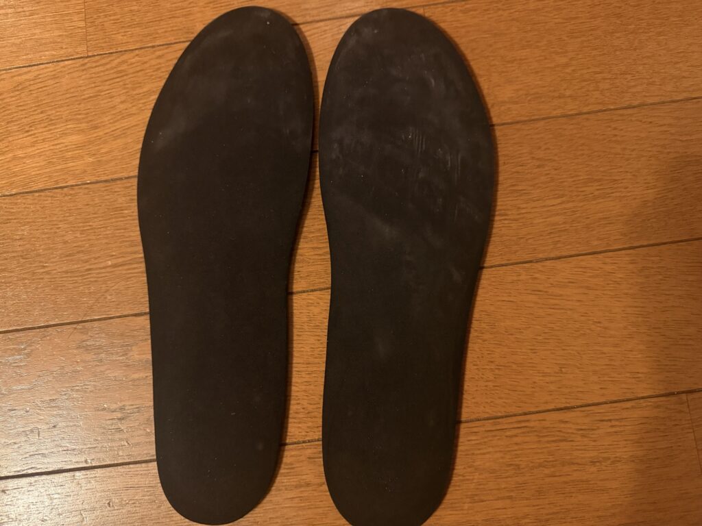 厚みは若干厚みがあるものの、均一。履いた時にフワッとした感じで、クッション性もある!でも、単独で使う前提じゃないから、素材が柔らかくて、靴の中で動くし、通気用の穴がないからムレムレ。